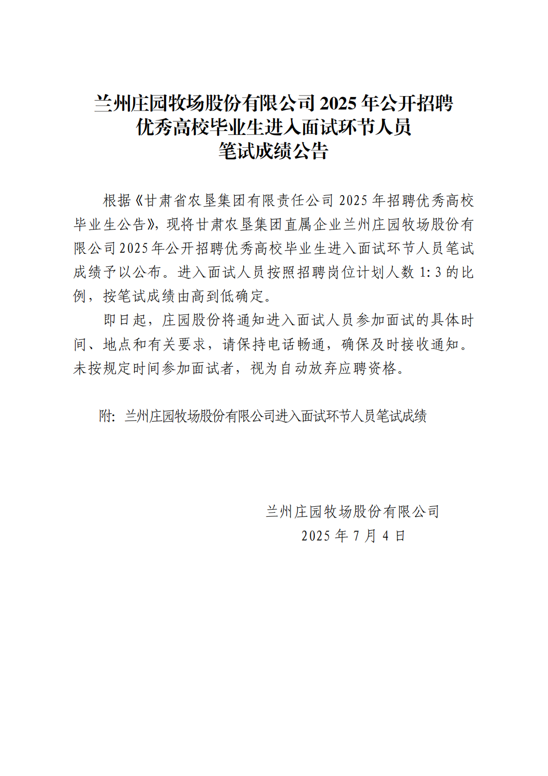 兰州庄园牧场股份有限公司2025年公开招聘优秀高校毕业生进入面试环节人员笔试成绩公告