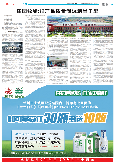 一个企业的发展并不是一蹴而就,而是在殷实的基础上循序渐进。兰州庄园牧场股份有限公司成立于2000年4月,是集奶牛养殖、技术研发、乳品加工、销售为一体的专业化乳制品生产制造企业,并且已经形成以自有牧场奶源为主要原料奶的液态奶产品的加工与销售为主的全产业链布局,甘肃省农垦集团有限责任公司是公司的控股股东,甘肃省政府国资委是公司的实际控制人。自成立伊始,庄园牧场始终坚持专业化经营战略,生根陇原大地,立足“奉献精良品质,造就时代品牌”的企业使命,专注打造全产业链经营与全要素创新相结合的乳品供应商、规范化运营和标准化管理相统一的市场拓荒者、政策性导向与特色化发展相适应的区域乳业排头兵。
