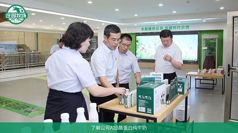 王纪旺一行参观了数字化生产车间、企业发展长廊和产品展示厅,并观看了庄园牧场宣传片。魏红兵介绍了公司的发展历程、现代化产业技术支撑体系、产业规模、奶源基地建设、新产品研发等相关情况。