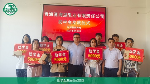 8月19日,庄园牧场子公司青海青海湖乳业有限责任公司在民和县教育局举行“2024年青海湖乳业捐资助学仪式”。在此次仪式上,资助民和县8名家庭困难且品学兼优的学子,每人资助5000元的助学金,共计现金4万元,并赠送了公司的牛奶和酸奶。