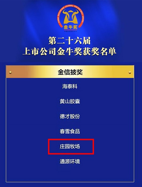 金信披奖不仅是对庄园牧场在信息披露方面优异表现的认可,也是对庄园牧场新一届领导班子稳健经营、规范治理成效的认可,体现了资本市场及社会各界对当下庄园牧场的高度认可。