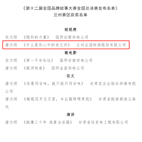 近日,由中国质量协会主办的2024年品牌创新大会暨第十二届全国品牌故事大赛全国总决赛在江西赣州举办,活动公布了《第十二届全国品牌故事大赛全国总决赛发布名单》。庄园牧场推荐的《什么是你心中的老兰州》荣获赛事短视频类“潜力级”奖项。